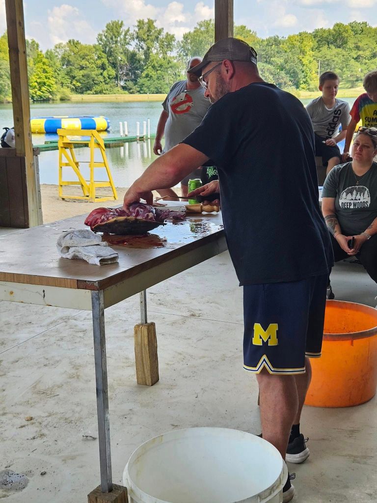 One particular youth event near and dear to our hearts is the Cookskin Camp that takes place each August at Camp Kutobic in Logan County. All three of the cousins and many members of their family including the newest generation, has gone through the camp making memories and learning skills that they would never been able to experience otherwise. The 2024 camp was very emotional in that our first lifetime hunting license was awarded in the memory of Les Longsworth. Les spent every moment he could in the outdoors, hunting, fishing and trapping. He was uncle to John, Jake and Gary, who started this organization.